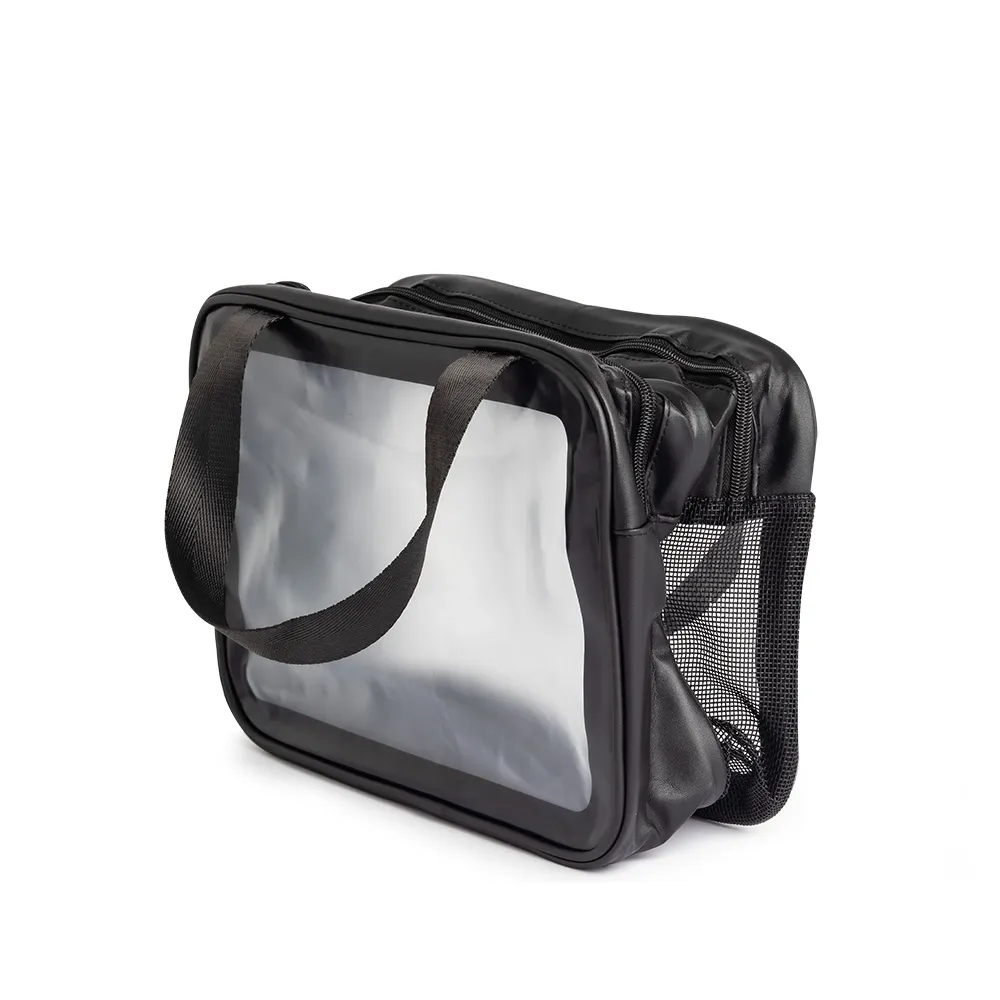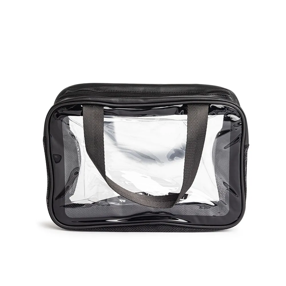 Nécessaire de PVC e PU com duas divisórias, uma delas em malha respirável, e duas alças laterais para facilitar o transporte.