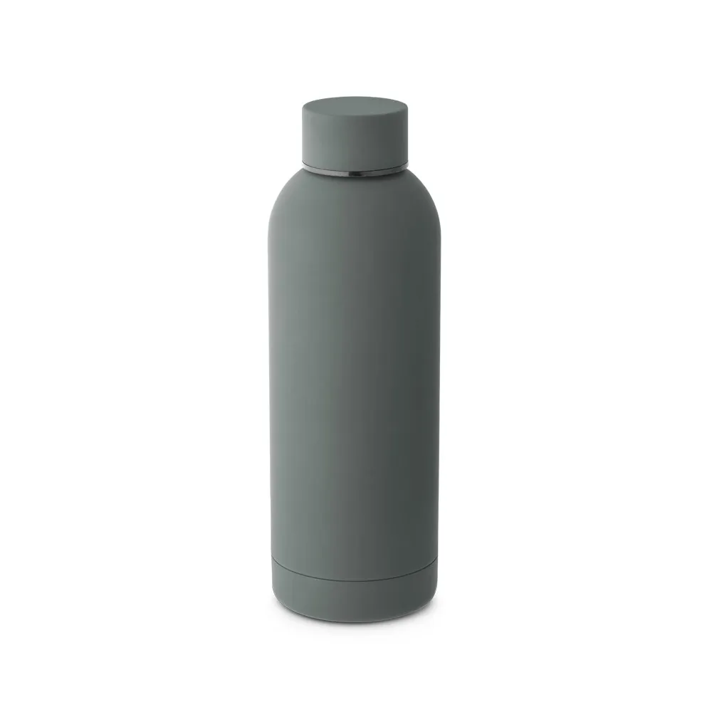 Garrafa em aço inox 36% reciclado de parede dupla térmica, isolada a vácuo, com tampa em aço inox. Parede com acabamento emborrachado dando um toque sofisticado. Capacidade até 550 mL. Preserva as bebidas quentes por 8 horas e as bebidas frias por 24 horas. Fornecido em caixa presente. Certificação EU Food Grade. ø70 x 220 mm