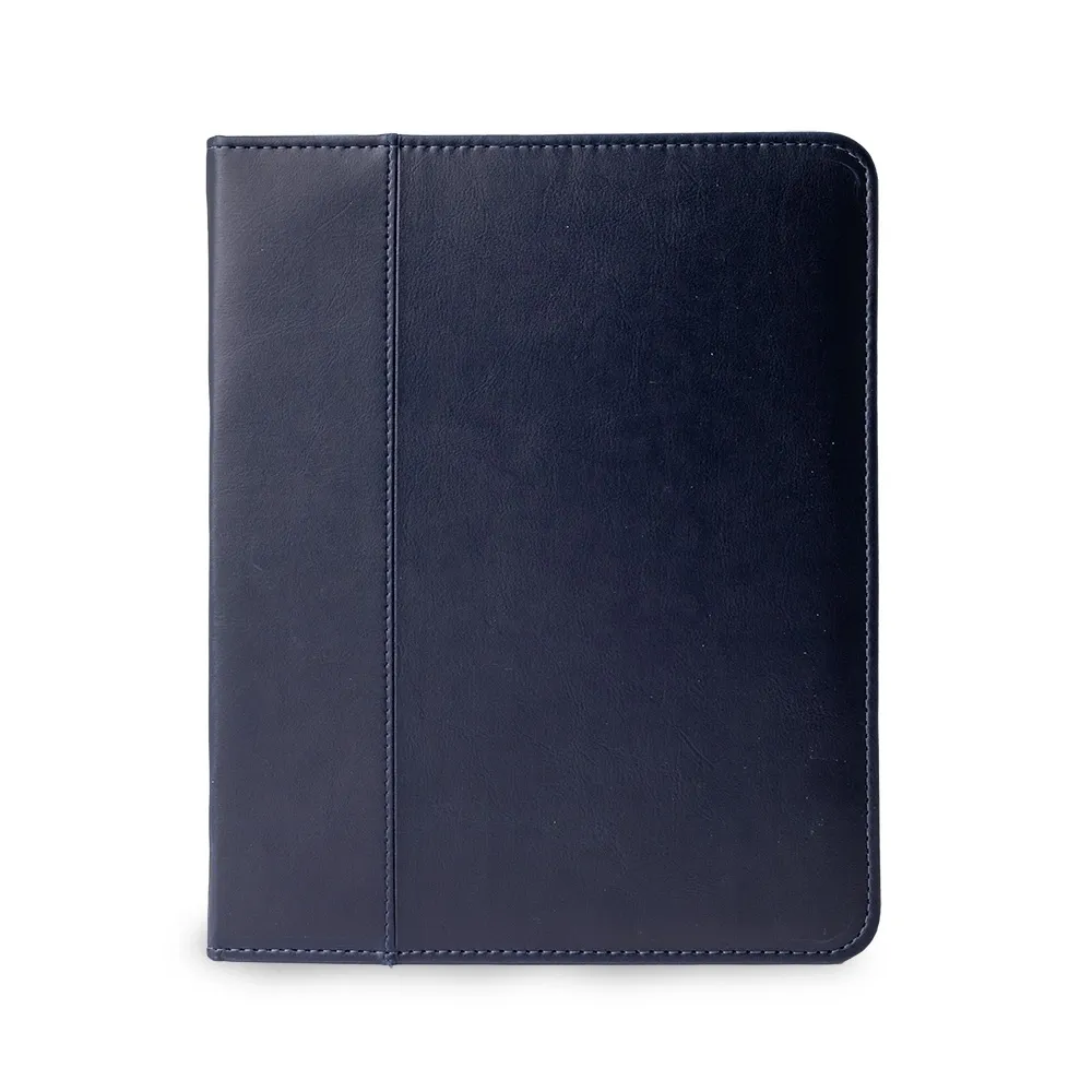 Pasta caderno de couro sintético com zíper. Possui 2 compartimentos para arquivar documentos e suporte para caneta (não acompanha caneta). A pasta contém caderno de capa dura em couro sintético, com aproximadamente 100 folhas.
