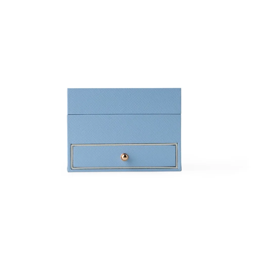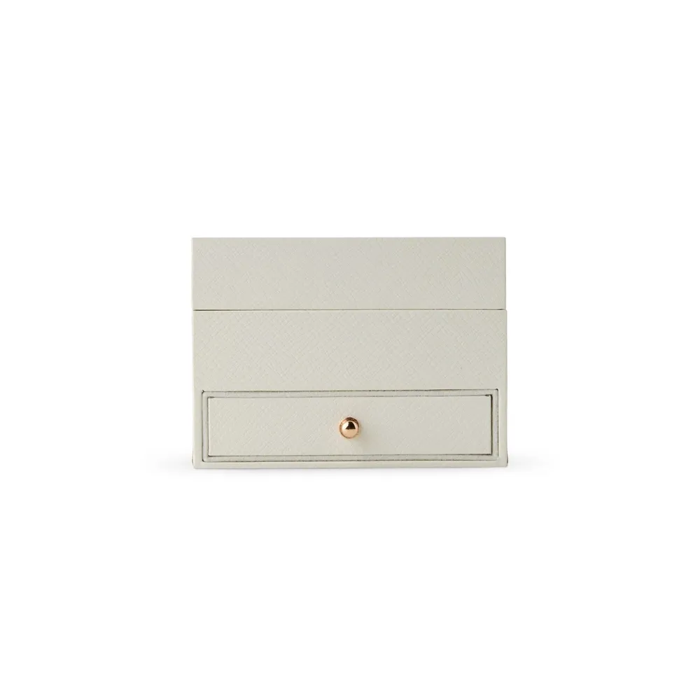 Porta-joias em couro sintético e revestimento interno em veludo. Possui três ganchos pequenos e um bolso elástico na parte interna da tampa, além de divisória multiuso removível e repartição almofadada com ranhuras para anéis, ambos localizadas no compartimento principal. Conta ainda com gaveta removível com puxador de alumínio.
