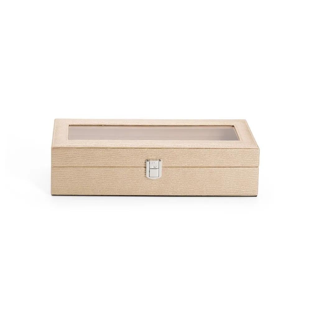 Porta-relógios com acabamento texturizado em couro sintético à base de PVC e revestimento interno em tecido aveludado. Possui seis divisórias com almofadas removíveis, visor de vidro e trava de segurança.