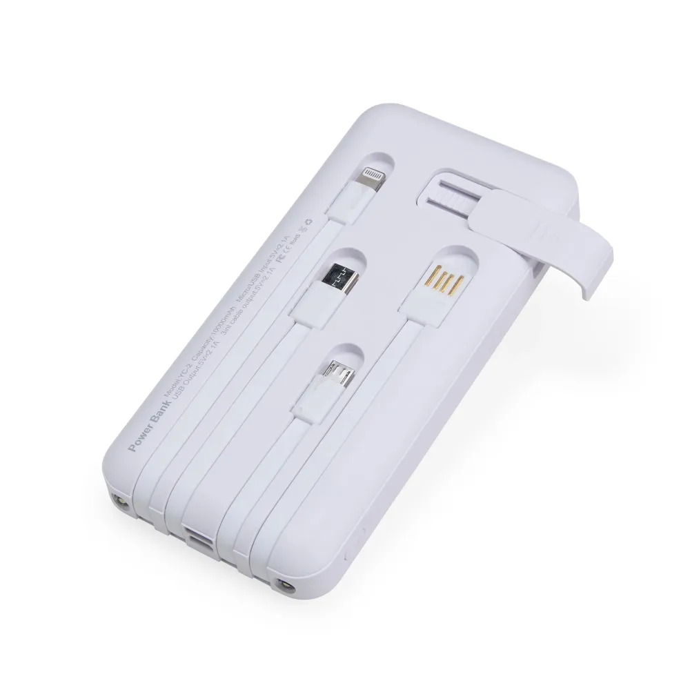 Nosso power bank 10.000mAh 4 em 1 é uma solução prática e eficiente para manter os dispositivos sempre carregados, mesmo quando estiver em movimento. Feito em plástico, possui cabos acoplados com saídas para: Lightning, tipo-C, micro-USB e USB. Apresenta entradas USB-C e micro-USB dedicados apenas para a recarga do aparelho, além de suporte lateral para celular integrado, além de duas lanternas para situações de emergência. Sua entrada micro-USB 5V=2.1A e saída USB 5V=2.1A, oferece um desempenho eficiente e rápido para o dia a dia.