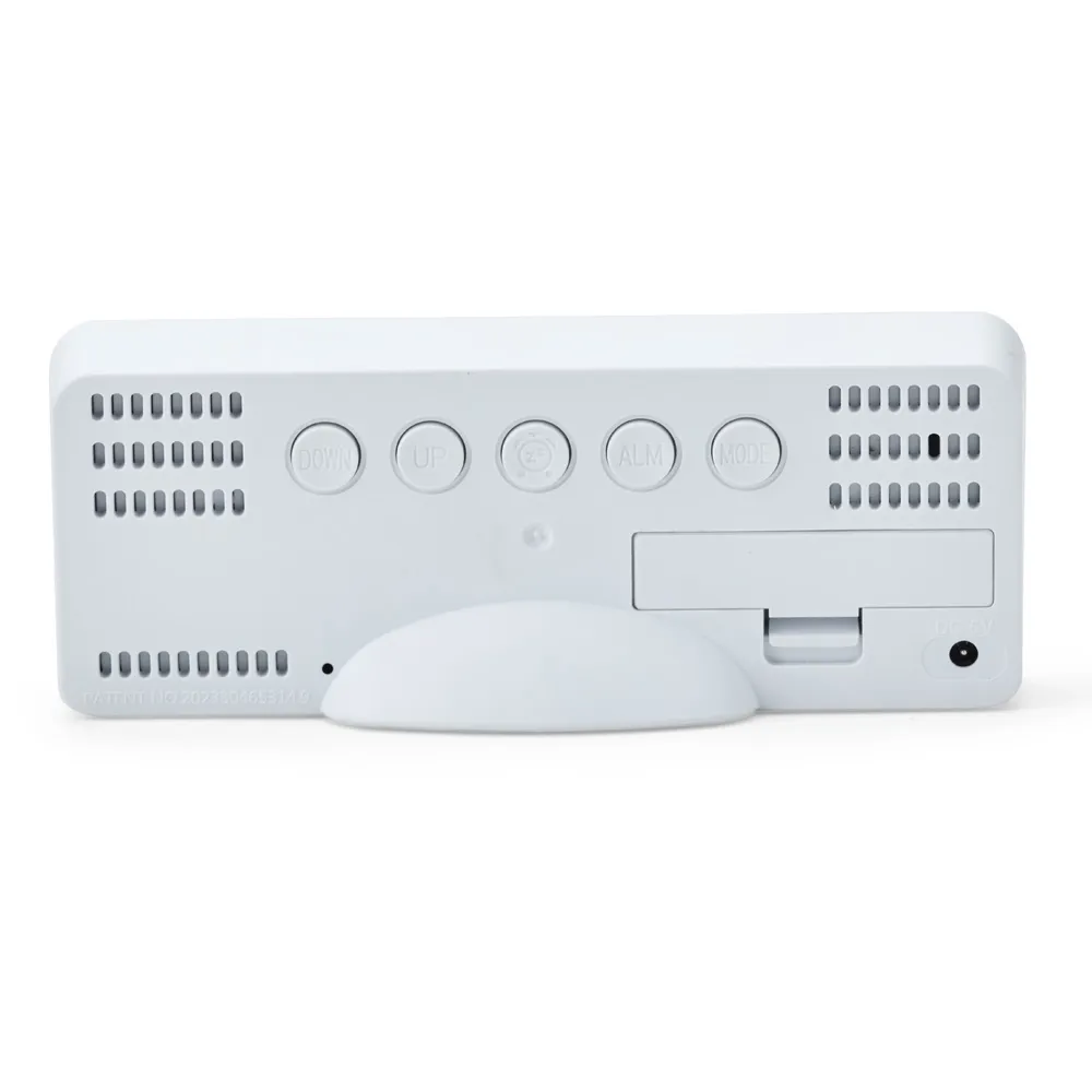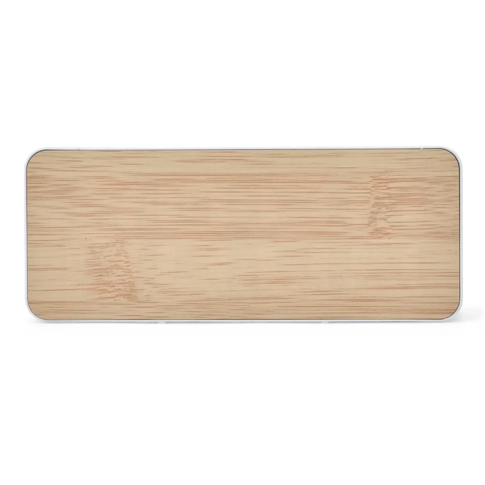Relógio feito em bambu com detalhes em plástico, três níveis de iluminação em LED para a exibição de informações além das horas, incluindo temperatura ambiente e data do dia. Conta também com a opção de programar alarmes e ajuste de frequência sonora. Funciona com uma pilha AAA (não inclusa) ou via cabo DC de 5V que acompanha o relógio.