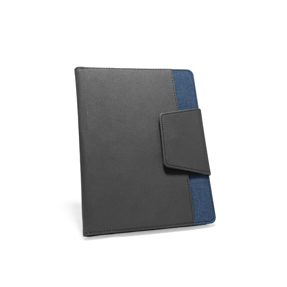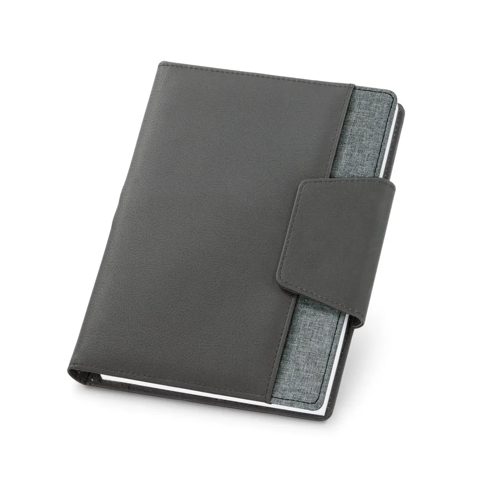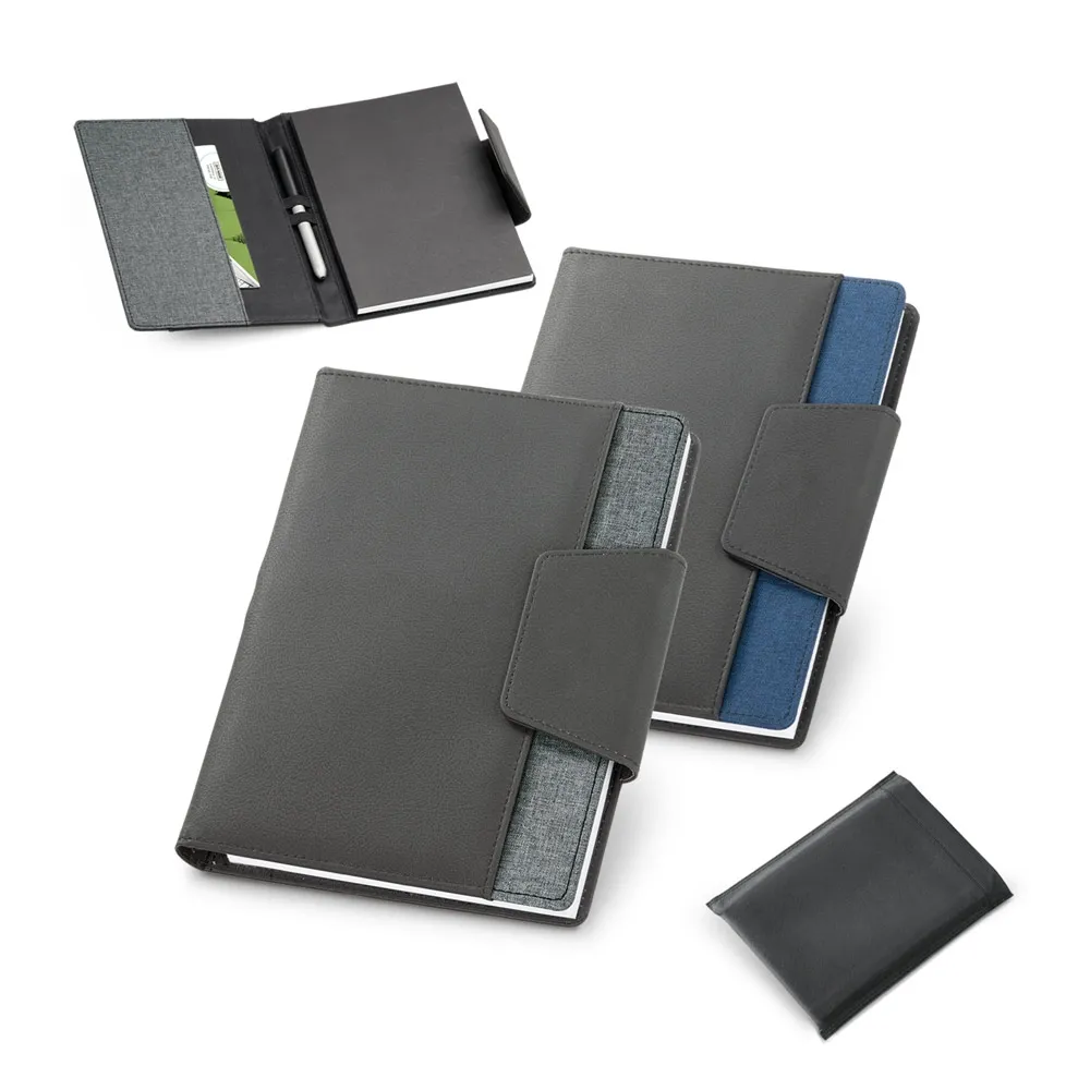Capa em c. sintético e tecido em poliéster com caderno A5 removível com 160 páginas lisas. Contém fecho magnético, bolso exterior, bolso interior e suporte para esferográfica (não inclusa). Fornecida em embalagem de non-woven. 155 x 215 mm | Bolsa: 205 x 250 mm