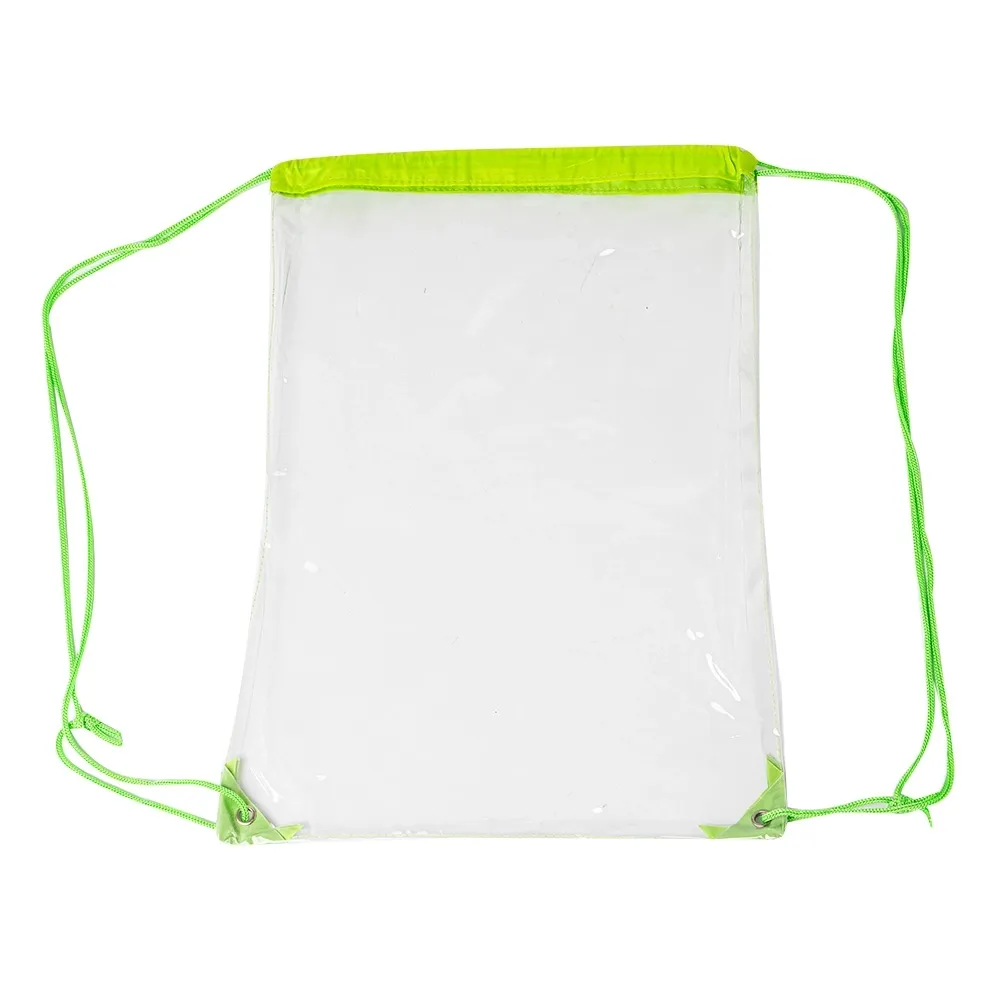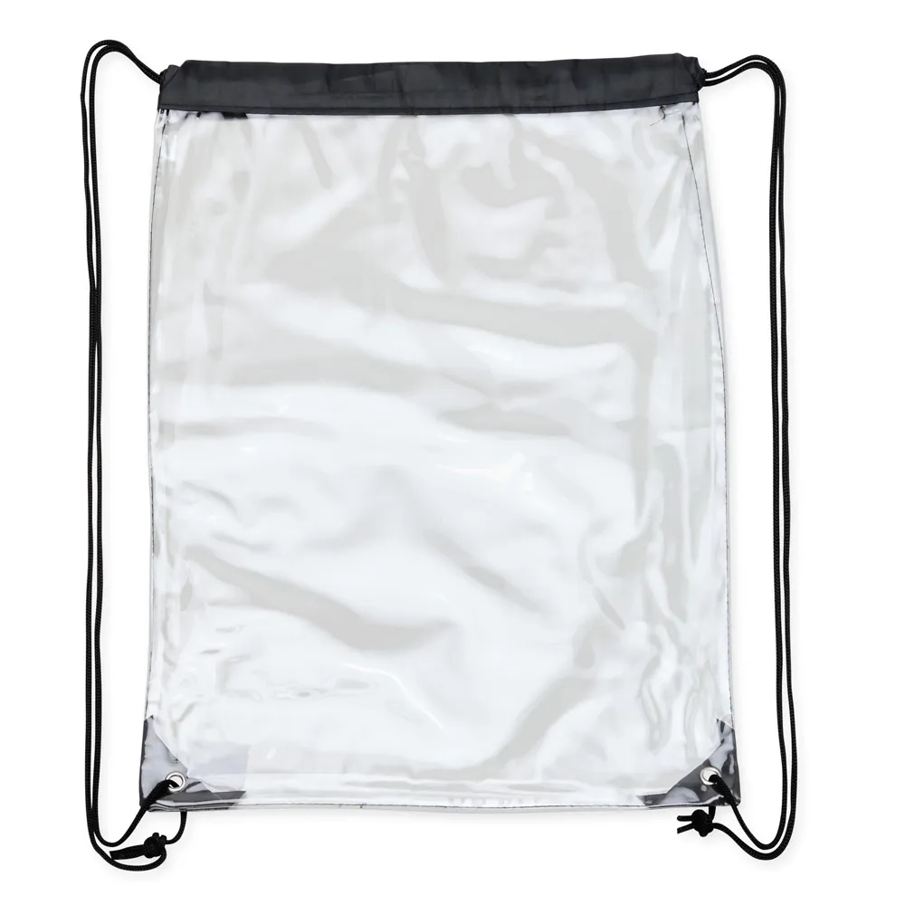 Sacochila em PVC transparente com detalhes em tecido nylon, alças reguláveis e dois ilhós metálicos.