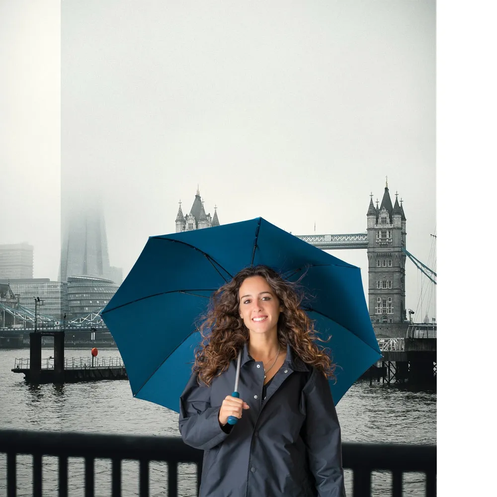 Guarda-chuva em poliéster pongee 190T, com varetas em fibra de vidro, cabo em alumínio e haste revestida em borracha. O guarda-chuva tem abertura automática e é à prova de vento. Fornecido em bolsa com alça curta para facilitar transporte. ø1025 x 855 mm | Bolsa: 90 x 635 mm
