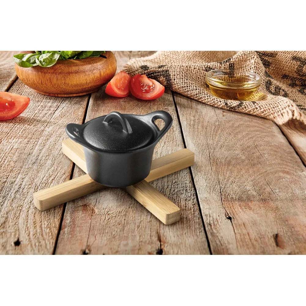 Descanso de panela dobrável em bambu. Fornecido em caixa oferta em papel kraft reciclado. A cor e o resultado da impressão nos materiais naturais pode variar entre produtos. Fechado: 215 x 40 x 14 mm | Aberto: 180 x 150 x 14 mm