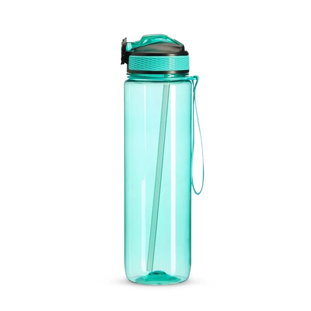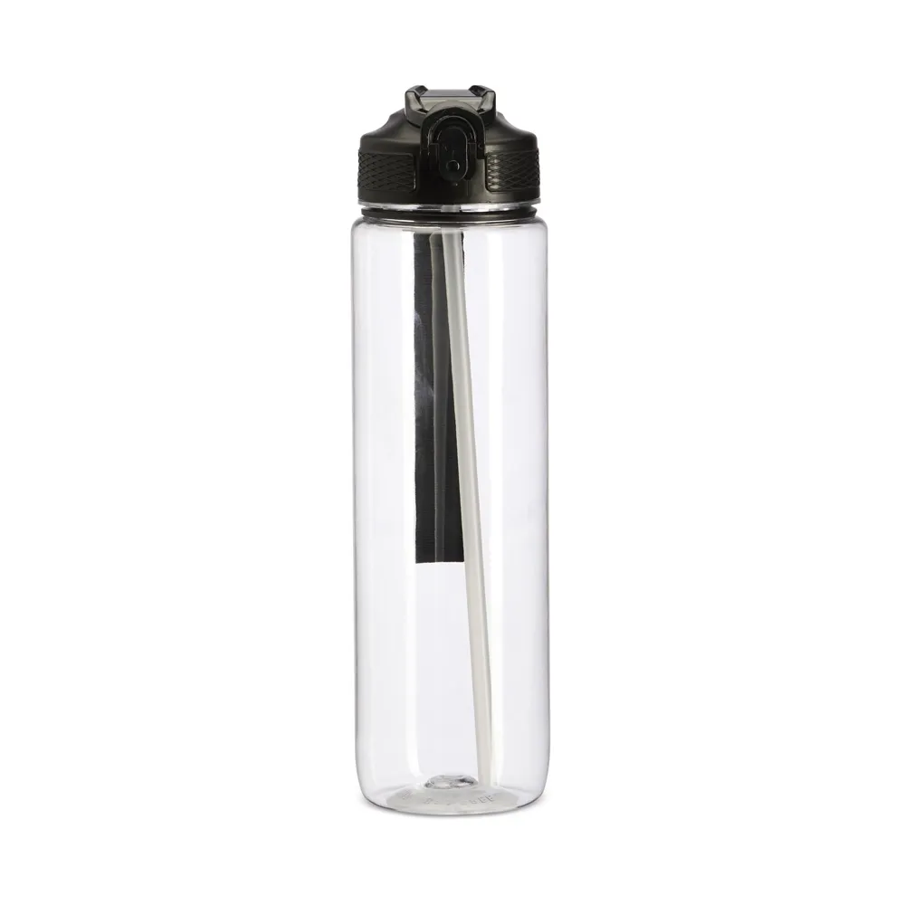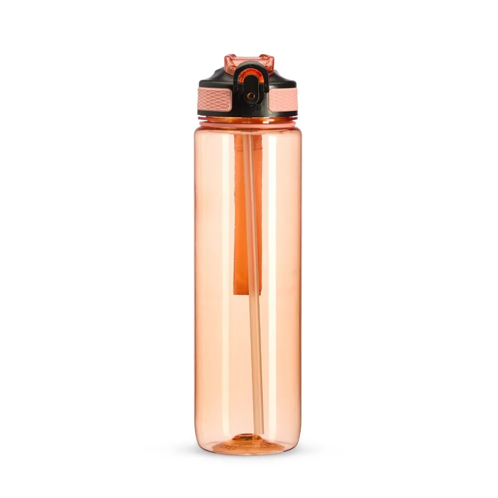 Squeeze plástico com capacidade de 1 litro, livre de BPA. Possui tampa rosqueável com bico de canudo, tampa protetora, botão de acionamento e trava de segurança. Acompanha cordão de nylon e canudo.