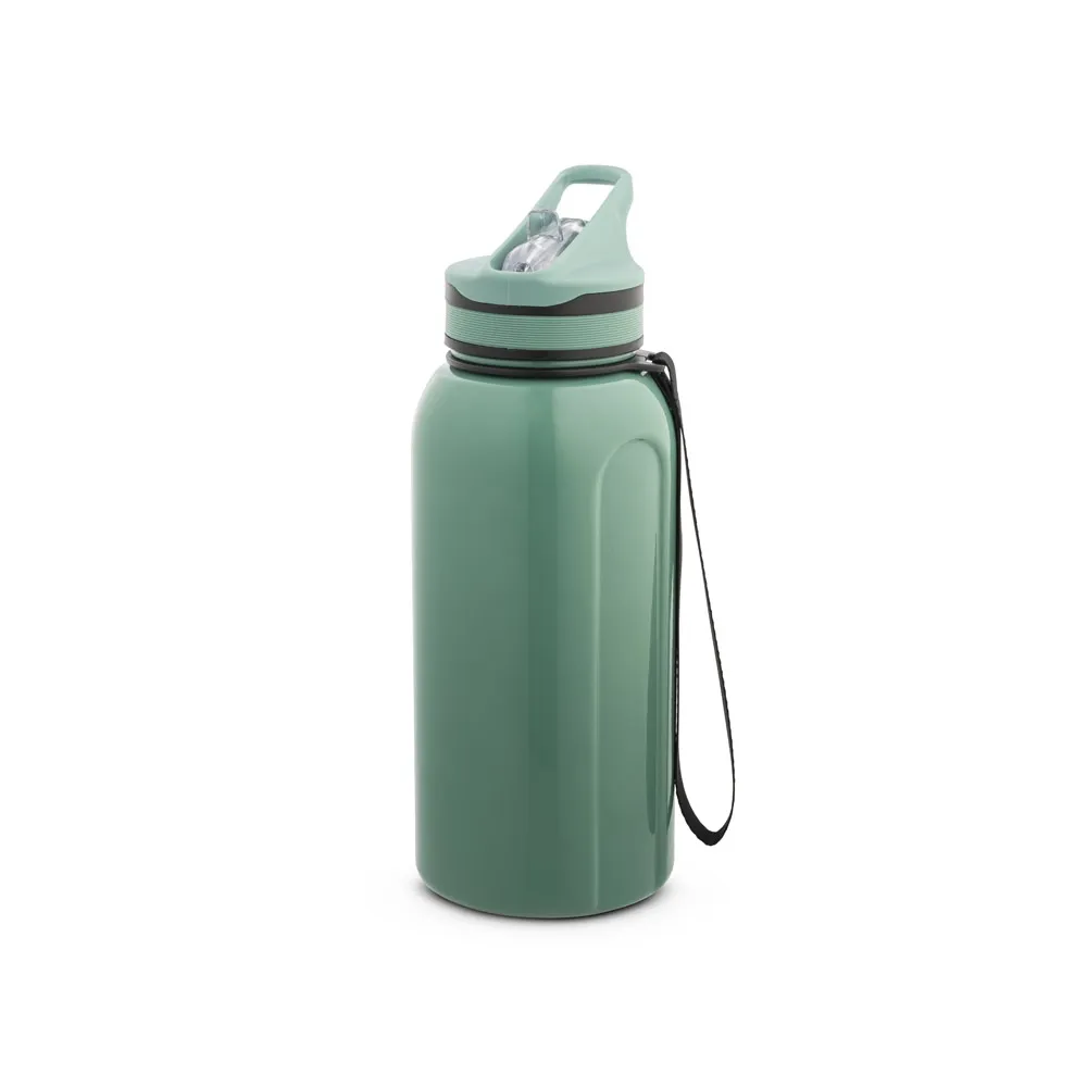 Squeeze esportiva em PETG, tampa com bico de canudo flip e canudo flexível no interior, com pega para facilitar o transporte. Grande capacidade até, 1230 mL. Certificação EU Food Grade. Ø95 x 252 mm